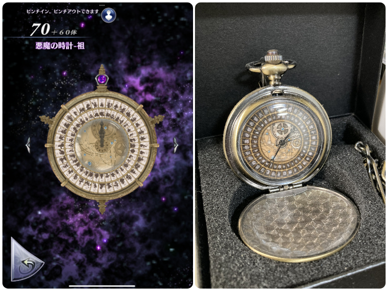 前々から悪魔の時計(画像左)モチーフのグッズとか出ないかな~と思ってたら本当に出たので手に入れました(右)